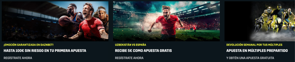 Aparte de las tradicionales apuestas deportivas, DAZN Bet también ofrece mercados especiales y promociones que enriquecen la experiencia de apuestas. Esto incluye apuestas en eventos grandes como los Juegos Olímpicos o la Copa del Mundo, así como promociones especiales durante eventos destacados, proporcionando más oportunidades de ganar y añadiendo un toque extra de interés a los eventos más esperados.