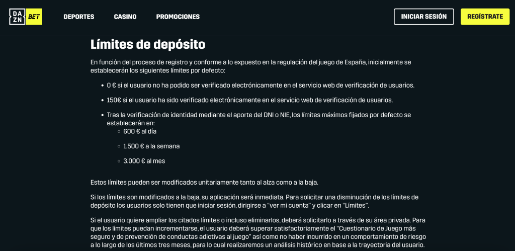 - DAZN Bet ofrece la opción de establecer límites en los depósitos y pérdidas para ayudar a los usuarios a gestionar su gasto en apuestas de manera efectiva. Estos límites pueden ser diarios, semanales o mensuales, proporcionando a los jugadores control sobre su actividad de apuestas.