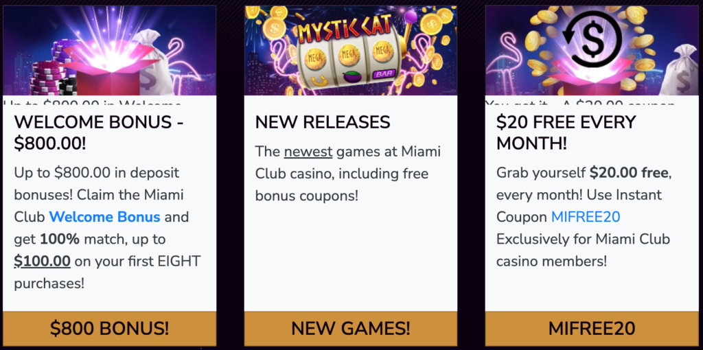 - Bonos y Promociones: Con generosos bonos de bienvenida y promociones regulares, Miami Club Casino ofrece a los jugadores muchas oportunidades para maximizar sus depósitos y prolongar su tiempo de juego.