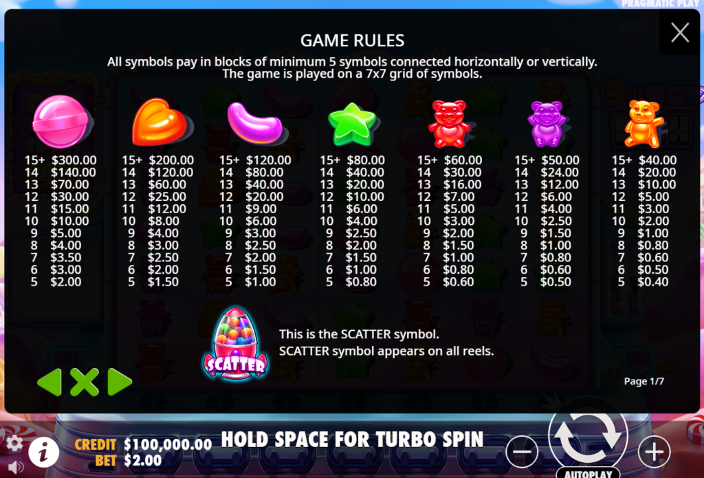 Los grupos ganadores provocan caídas que pueden generar multiplicadores de hasta 128x. En la función de giros gratis, los puntos multiplicadores se mantienen, lo que significa que te beneficiarás de multiplicadores más grandes cuantas más veces ganes en los puntos multiplicadores. La simplicidad del juego es la razón principal por la que Sugar Rush es un juego de tragamonedas tan popular.